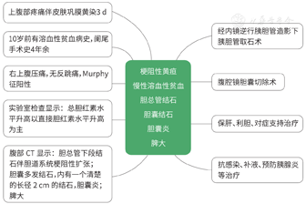 血常规:白细胞5.25×109/L,中性粒细胞百分比72.6%,血红蛋白97 g/L,血小板148×109/L。血生化:丙氨酸转氨酶190 U/L,天冬氨酸转氨酶55 U/L,总胆红素1005.1 μmol/L,γ-谷氨酰转移酶248 U/L,碱性磷酸酶149 U/L,胆碱酯酶4394 U/L,总蛋白107.7 g/L,白蛋白54.4 g/L,血淀粉酶73 U/L。凝血4项均正常。乙肝5项、丙肝抗体正常,甲肝抗体、戊型肝炎抗体阴性。肿瘤标志物:甲胎蛋白、癌胚抗原、CA199、CA724正常。血气分析正常。免疫学检查:ENA15项、抗核抗体、抗中性粒细胞胞质抗体正常。尿常规:黄色,尿胆红素(+++),尿胆原正常,尿潜血阴性。上腹部彩超:肝内胆管扩张,较宽处约0.7 cm;胆囊内可见数枚强回声团块,较大长径约2.2 cm,后伴条形声影;肝外胆管内径1.2 cm;脾脏斜径16.4 cm,厚径4.9 cm。胸腹部CT:胸部CT未见明显异常征象;胆总管下段结石伴胆道系统梗阻性扩张;胆囊多发结石,内有一个清晰的长径2 cm的结石,胆囊炎;脾大。