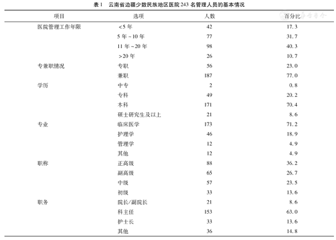 云南省边疆少数民族地区医院243名管理人员的基本情况