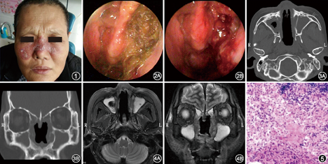 患者男,50岁,因"双侧鼻腔干燥伴涕中带血2年,加重伴面部皮疹3个月"于2016年11月5日入院。患者2年前无明显诱因出现双侧鼻腔干燥,伴涕中带血,为鲜血,量不多,无明显鼻塞、鼻痛,无发热、盗汗、潮红,无头痛、头晕,无咳嗽、咳痰,无眼痛、复视、视力下降,无耳鸣、听力下降,未予重视。3个月前患者自觉鼻部症状加重,伴流脓涕、嗅觉下降,发现面部散在丘疹,色红,有压痛,随后皮损面积扩大并融合成红褐色斑块,摩擦后表面有溃破,伴脓性分泌物流出。曾于外院就诊,给予中西医结合治疗(具体不详)及面部抗生素软膏涂抹,疗效欠佳,为进一步治疗来我院。查体:体温36.5℃,脉率76次/分,呼吸18次/分,血压107/78 mmHg(1 mmHg=0.133 kPa)。外鼻无畸形,皮肤丘疹自鼻根部向两侧蔓延,呈地图样,表面有溃破,可见脓性分泌物,表面有黄褐色污秽物附着(图1)。鼻前庭皮肤红肿,鼻毛脱落。鼻中隔大穿孔,鼻腔黏膜充血,双侧中鼻道及嗅裂见脓性分泌物,双侧下鼻甲及中鼻甲破坏,鼻中隔及鼻甲后端可见溃疡样新生物,周围黏膜组织充血、水肿(图2),双侧鼻窦区无明显压痛。悬雍垂缺失,软腭见瘢痕。入院诊断:鼻肿物;鼻中隔穿孔;面部皮疹。入院后完善血常规、生化检查,均未见明显异常;取皮肤分泌物做细菌培养,结果为金黄色葡萄球菌。给予抗生素软膏涂抹,疗效欠佳,后请皮肤科、呼吸内科等相关科室会诊,完善如下相关检查。T细胞斑点试验,检查结果为抗体A:53 SFCs/2.5E5 PBMC;抗体B:56 SFCs/2.5E5 PBMC[正常参考范围:(抗体A+抗体B)<6 SFCs/2.5E5 PBMC,若≥6 SFCs/2.5E5 PBMC则提示存在结核感染]。鼻窦CT平扫示:双侧上颌窦、筛窦、额窦、蝶窦内软组织密度影填充,窦壁骨质硬化,鼻中隔后端、双侧中下鼻甲骨质破坏(图3)。鼻窦MRI平扫示:全组鼻窦内长T1长T2信号影,鼻中隔后端、双侧中上鼻甲缺如,鼻骨及邻近双侧面颊部皮下软组织增厚,呈片状长T2信号影,鼻内病损与皮肤及皮下病损有连续性(图4)。胸部CT平扫示:骨性胸廓对称,纵隔、气管居中。双肺纹理稍粗,未见明显结节影,纵隔内未见肿大淋巴结影,心影未见异常。鼻内镜下取鼻腔内病损送病理,可见朗格汉斯巨细胞,周围有较为致密的淋巴细胞浸润,考虑结核结节(图5)。患者鼻结核诊断明确,后转入传染病医院就诊,给予患者异烟肼300 mg、利福平450 mg、乙胺丁醇750 mg每天1次口服三联抗结核治疗。2个月后回院复查皮疹减轻,遗留色素沉着及瘢痕。拟继续上述治疗4个月。