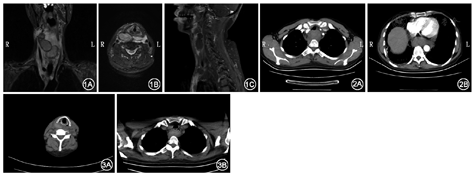 自发性颈部血肿多继发于感染、颈部或血管外伤、医源性损伤(如置管、血管造影、手术)或异物等,是一种罕见的危及生命的临床疾病。典型的临床表现为气管或食管受压、气管移位,以及随后而来的皮下瘀斑及颈部肿胀,其他还包括吞咽困难、声音嘶哑及局部疼痛等。自发性颈部血肿更为罕见,文献中仅见数例报道,其发生原因可能与感染、凝血功能异常及动静脉畸形等有关,近年来的国内外的个案报道提示甲状旁腺、甲状腺腺瘤囊外出血[1,2,3,4,5]、甲状腺乳头状癌[6]、纤维肌性发育不良[7]、神经纤维瘤病Ⅰ型[8]等均可与自发性颈部血肿有关,鉴别诊断时需考虑。此外,还有报道呛咳[9]、过度发声[10]引起颈部血肿的案例。颈部血肿的诊断主要依靠病史、查体,以及必要的辅助检查,如CT、MRI、B超,甚至血管造影检查,其中CT及MRI对于诊断颈部血肿起着重要作用。