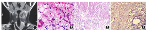 IMT的临床表现被认为是一种炎性反应向交界性肿瘤发展的缓慢过程,具有局部侵袭性生长、复发倾向,治疗以手术联合免疫抑制剂和化疗药物(顺铂、阿霉素和甲氨蝶呤)[12]、放射治疗等治疗。然而,甲状腺IMT的临床表现不同,所有报道的病例均为良性,且没有复发;所以,手术切除是首选的治疗方法,切除范围是尽可能全部切除患侧甲状腺组织,术后给予左旋甲状腺素钠进行替代治疗[13],不需进行免疫抑制及化疗药物、放射等治疗。