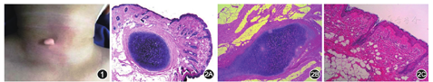 副耳在组织病理学上表现为大量的不同阶段的微小成熟毛囊、皮下脂肪组织中含有结缔组织,大多含有弹性软骨[9],易与腮裂囊肿和瘘管、皮赘、表皮样囊肿、纤维瘤、乳头状瘤等鉴别。错构瘤与副耳的组织学表现相似,其中毛囊痣与不含软骨的副耳基本无差别,只能结合临床表现来诊断[7]。多数颈部副耳出现的位置典型较易诊断,少数不典型部位的副耳则难以鉴别,有可能被诊断为毛囊痣[10]。