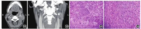 患者男,65岁,因"咽痛2个月"于2018年2月24日就诊于青岛市市立医院耳鼻咽喉头颈外科。入院检查见患者消瘦,左侧扁桃体表面为黄白色、形态不规则肿物,外生性生长,范围超越中线,但其基底未侵犯软腭及悬雍垂,软腭活动正常(图1);向下波及部分舌根组织,但下咽侧壁及劈裂、声门未侵犯,声带活动正常。左侧颌下区可触及一个大小约3 cm×2 cm×2 cm的质硬淋巴结,位置固定,无压痛。患者既往有糖尿病史、胃结石及胃镜下取石术史。增强CT提示左侧Ⅱ区淋巴结转移可能,且转移淋巴结内可见明显钙化影(图2)。行扁桃体肿物活检提示:左侧扁桃体鳞状细胞癌(图3)。入院诊断为:左侧扁桃体鳞状细胞癌伴淋巴结转移;糖尿病;胃结石史。术前胃镜检查排除食道及胃部肿瘤,排除肺、脑、骨等器官病变,控制血糖<8 mmol/L后于2018年2月28日在全麻下行左侧扁桃体癌根治术+舌根部分切除术+Ⅰa区及左侧Ⅰb区、左侧Ⅱ、Ⅲ、Ⅳ区淋巴清扫术+颌下腺切除术。术中见左侧Ⅱ区淋巴结与颈內静脉粘连明显。冰冻切缘阴性,舌根部创面对位缝合。手术顺利。术后予以对症支持治疗,创面逐渐愈合。术后石蜡病理报告:①扁桃体中分化鳞状细胞癌,癌组织侵及横纹肌,脉管内可见瘤栓;②颌下腺未累积;③(Ⅱ、Ⅲ、Ⅳ区)淋巴结(1/21)见恶性瘤细胞转移,结合免疫组化,肉瘤可能性大;免疫组化:Ki-67(约70%+)、p63(+)、p53(突变型)CK5/6(+)、CD34(瘤栓-)、D2-40(瘤栓+)、p16(-)、p40(+)、CK(-)、Vim(+)。因病理结果提示原发灶扁桃体肿瘤为中分化鳞状细胞癌(简称鳞癌)而转移淋巴结提示肉瘤,两者性质不统一,再次行免疫组化以明确肉瘤性质及来源。同时完善检查以排除其他组织与器官肉瘤,腹膜后超声未见明显异常。第二次免疫组化结果,提示1个(1/21)淋巴结内见癌组织转移,可见恶性瘤细胞呈梭形,弥漫分布,核分裂象多见,可见钙盐沉着及骨样基质,考虑鳞癌转移伴肉瘤样分化,原免疫组化另增加S-100(-)、Desmin(-)、SMA(-)、CD35(-)、CD21(-)、actin(-)、CD34(-)、CD68(+)、β-catenin(-)。该患者术后于第5周开始进行放化疗(60 Gy+TP方案)联合治疗,5个半月后因肺转移及并发症死亡。