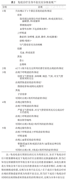 注:a免疫疫苗应用部位的反应为局部反应,如舌下免疫治疗后口腔黏膜痒或皮下免疫治疗后注射部位皮肤温暖或痒,但当已知变应原被曾因其导致全身不良反应的患者接触时,如花生被有花生导致全身不良反应史的患者放在口内或者吞咽后,出现口或唇的刺痛或痒感,应视为全身不良反应;b舌下或经口免疫治疗时出现的胃肠道症状视为局部不良反应,但当舌下或经口免疫治疗时同时出现胃肠道和其他系统症状/体征时,应视为全身不良反应
