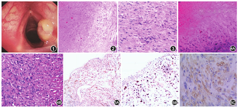 患者女,54岁,主因声带肿物切除术后再发声音嘶哑9个月于2016年5月4日来中南大学湘雅三医院就诊。患者曾因声音嘶哑6个月余于2015年7月22日在外院就诊,行电子喉镜检查结果示:声带肿物,癌?(图1)。完善检查后行"全麻下喉内镜右声带新生物清除术",术后病理提示:考虑肌纤维母细胞来源肿瘤,低度恶性可能。术后9个月患者仍有声音嘶哑,来我院就诊,间接喉镜示:右侧声带充血肥厚,前端可见透明新生物生长,累及左声带及前连合,声门闭合差。在支撑喉镜激光下行气管及喉部新生物切除术。术后病理回报:(喉部声带肿块)黏膜慢性炎,区域梭形细胞瘤样增生伴明显胶原化,小血管增生,其中少数间质细胞核大,结合免疫组化倾向为术后反应性改变(图2),但该部位有炎症性肌纤维母细胞瘤的病史,且未见到原手术切片进行对比,建议密切追观,除外原肿瘤术后复发可能。免疫组化:S100(-)、SMA(个别+)、BCL-2(少数+)、CD34(-)、β-Catenin(-)、ALK(-)、Ki-67(3%)。术后4个月患者再次无明显诱因出现声嘶、发声费力,来我院复查,间接喉镜示:双侧声带近前连合处可见粉红色新生物,表面光滑,声门闭合欠佳。遂行支撑喉镜激光下声带新生物切除术。术后病检:(声带新生物)黏膜慢性炎,局灶梭形细胞瘤样增生,间质黏液变性(图3),结合病史及免疫组化倾向炎症性肌纤维母细胞肿瘤复发可能性大,肿瘤多次复发,低度恶性不能排除,建议密切随诊。免疫组化:S100(-)、SMA(+)、BCL-2(-)、CD34(-)、β-Catenin(+)、Actin(少数+)、ALK(-)、Ki-67(5%)。术后8个月,患者再次出现声嘶、发声困难,外院CT示:声门上区富血供结节灶,结合既往病史考虑炎症性肌纤维母细胞瘤(复发)可能性大,建议活检明确。为求进一步治疗故来我院行喉次全切除术,术后病理诊断:(左、右喉新生物)梭形细胞肿瘤,区域瘤细胞增生活跃,有异型,向周边骨骼肌内浸润性生长,局灶侵犯软骨组织,结合免疫组化考虑低-中度恶性肌纤维母细胞肉瘤(图4)。免疫组化:S100(-)、SMA(+)、BCL-2(-)、CD34(-)、β-Catenin(+)、Actin(弱+)、CD31(-)、Calponin(+)、H-Caldesmon(-)、ALK(-)、Ki-67(30%),见图5。术后随访36个月,肿瘤无复发及转移,患者目前生存状况良好。