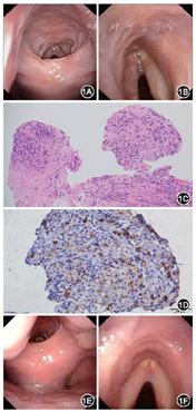 例1 患者女,46岁,因“声嘶、气促4个月”于2019年3月28日就诊于南方医院耳鼻咽喉头颈外科门诊。患者4个月前因声嘶、气促就诊于外院呼吸科,伴咽异物感,无发热、咽痛、咳嗽、咳痰等。患者的肺功能及肺部CT检查无异常,纤维支气管镜检查发现声门上方一肿物,遂转入该院耳鼻咽喉科。电子鼻咽喉镜检查显示:声门上方见一肿物,披裂、室带水肿、苍白,喉腔狭窄,取声门上肿物活检。活检病理结果为:黏膜下肉芽组织形成。患者为进一步诊治于2019年3月28日来我院耳鼻咽喉头颈外科就诊。电子鼻咽喉镜检查显示:会厌喉面、双侧杓会厌襞见可疑瘢痕组织形成(图1A),双侧声带全程欠光滑,前端粘连,双侧声带闭合可(图1B)。喉部增强CT检查显示,双侧颈部淋巴结稍增大,余无异常。取声带黏膜活检,病理回报:炎性息肉。2019年4月7日以“喉梗阻(Ⅰ度)”收入我科。入院后实验室检查:血常规、尿常规、大便常规、肝功能、肾功能检查均无异常,风湿四项(-)、抗中性粒细胞抗体(-)、自身免疫性疾病14项(-)、抗核抗体(-)、红细胞沉降率(-)、血清IgG4正常。胸片、心电图无异常。全麻下扩大范围重新取活检,部位包括会厌、杓会厌黏膜及少许软骨组织。病理回报:纤维组织增生伴慢性炎(排除淋巴瘤等恶性肿瘤),IgG4+浆细胞>50个/HPF,IgG4+浆细胞/IgG+浆细胞约15%,疑似IgG4-RD。考虑患者4个月前在外院曾接受喉部肿物切除术,遂借取外院喉肿物组织玻片,加做IgG4、IgG免疫组化,结果回报:大量纤维组织增生,大量浆细胞及淋巴细胞浸润(图1C),IgG4+浆细胞>50个/HPF,IgG4+浆细胞/IgG+浆细胞>40%,确诊IgG4相关性疾病(图1D)。予甲泼尼龙 40 mg/d,3周后复诊,呼吸不畅明显缓解逐渐减量,口服激素2.5个月后,患者无声嘶、气促表现,电子鼻咽喉镜检查显示,双侧双侧杓会厌皱襞黏膜光滑(图1E),会厌喉面黏膜光滑,声带全程黏膜光滑,闭合佳(图1F)。随访半年,患者病情平稳。