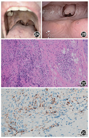 例2 患者女,44岁,因“渐进性呼吸困难伴吞咽困难5个月”就诊于我院耳鼻咽喉头颈外科门诊。患者5个月前无明显诱因出现渐进性气促、吞咽困难,伴咽痛,无发热、咳嗽、咳痰。2019年5月5日就诊于我院,查体见双侧咽腭弓、舌腭弓纤维化明显,左侧为重,悬雍垂左偏(图2A)。电子鼻咽喉镜:口咽、下咽及喉腔黏膜苍白,口咽平面见环形瘢痕狭窄,舌根及咽后壁瘢痕增生,会厌黏膜苍白肿胀,双侧声带活动可(图2B)。颈部增强CT示:口咽及下咽软组织弥漫性增厚,咽腔狭窄;双侧颈部分淋巴结稍肿大。入院诊断:Ⅱ度喉梗阻;咽腔、喉腔瘢痕狭窄(原因待查)。入院后实验室检查:风湿4项(-)、抗中性粒细胞抗体(-)、自身免疫性疾病14项(-)、抗核抗体(-),血清IgG4 2.93 g/L(正常值0.03~2.01 g/L)。急诊行气管切开以及口咽、喉咽病变活检。病理回报:纤维组织增生,大量浆细胞及淋巴细胞浸润(图2C),IgG4+浆细胞>50个/HPF,IgG4+浆细胞/IgG+浆细胞>50%(图2D)。确诊IgG4-RD。予甲泼尼龙30 mg/d,2周后,患者呼吸困难及吞咽困难改善明显,逐渐减量,以20 mg/d维持治疗。3周后患者症状明显改善,拔除气管套管后无呼吸困难及吞咽困难。口服激素治疗共3个月,复查血清IgG4 2.17 g/L较前明显降低,复查电子鼻咽喉镜较前无明显改变。随访半年,患者病情平稳。