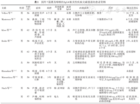 以“IgG4相关性疾病”和“咽喉”为关键词在万方数据库、中国期刊全文数据库未检索到相关报道。以“IgG4-related disease”和“larynx”为关键词在pubmed检索,共检索到英文文献7篇[8, 9, 10, 11, 12, 13, 14],包括病例10例(表1),男性7例,女性3例,年龄50~62岁,病程2个月至20年。主要症状包括声嘶、发声障碍、呼吸困难、吞咽不畅、咽痛等。其中单纯累及咽喉者6例,合并累及其他脏器者4例。7例患者血清IgG4升高,1例患者正常,2例患者未测。5例患者接受单纯激素治疗,获得较好疗效;2例患者接受利妥昔单抗治疗获得较好疗效;1例患者激素不耐受改用利妥昔单抗治疗后获得较好疗效;1例患者激素不耐受改用硫唑嘌呤治疗后获得较好疗效;1例患者治疗及预后不详。