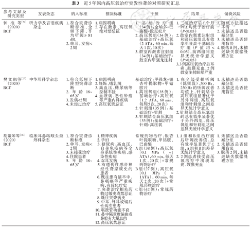 胡娅琴等[28] (2020) RCT | 临床耳鼻咽喉头颈外科杂志 | 1.符合突聋诊断标准 2.单耳,发病<2周 3.未接受治疗 4.住院患者 5.年龄18~65岁 | 1.精神疾病 2.孕妇 3.糖尿病、高血压、自身免疫病等全身系统性疾病、感染性疾病 4.双耳发病 5.有遗传性感音神经性聋家族史的患者 6.既往患有脑卒中、鼻咽癌等严重疾病,有放化疗史 7.突聋治疗相关药物过敏史或禁忌证 8.既往突聋病史 9.中耳、外耳或蜗后性病变患者 10.咽鼓管功能不良 11.鼻中隔重度偏曲或鼻腔有大量息肉 12.高压氧禁忌证 | 常规药物治疗:银杏叶提取物、甲钴胺、巴曲酶 A组(38例):高压氧[0.1 MPa(≈1 ATA),60 min,每天1次,20次]+常规药物治疗 B组(27例):高压氧[0.1 MPa(≈1ATA), 60 min,每天2次,20次]+常规药物治疗 C组(42例):常规药物治疗 | 1.A组和B组治疗前后听阈改善值、总有效率显著优于C组,A组和B组差异无统计学意义 2. 2例患者接受高压氧治疗中出现耳痛、鼓膜充血 | 1.未描述是否隐藏分组 2.未描述是否使用盲法 3.脱落2例,未描述缺失数据处理方法 |