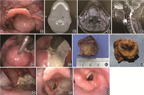 患者女性,47岁,因咽部异物感及活动后呼吸困难半年就诊于大连医科大学附属大连市中心医院耳鼻喉科。患者于进食团块状食物时吞咽受限,且活动后呼吸困难,无咽痛、无声嘶、无痰中带血等症状。专科查体:电子喉镜检查见右侧梨状窝处较大类圆形光滑肿物,表面为正常黏膜,直径约2.5 cm,遮盖部分声门,双侧声带黏膜光滑,运动良好(图1A)。电子胃镜检查及颈部淋巴结超声检查未见明显异常。咽喉部增强CT示右侧声门上区及声门区可见不规则软组织密度影,其内合并液化坏死,边界欠清,邻近组织未见侵犯(图1B)。喉部增强MRI检查示右侧下咽部声门上区不规则团块状异常信号肿物影,T1WI呈等稍低信号,T2WI/STIR呈不均匀高信号,静脉注射造影剂后病灶呈不均匀强化,大小约2.7 cm×2.1 cm×2.1 cm,与周围组织分界欠清,咽腔狭窄(图1C、1D)。入院诊断为下咽部肿物。排除手术禁忌后行手术治疗,术式为先于局麻下行气管切开术,之后全身麻醉,采用喉内径路内镜下等离子射频肿物切除术(图2)。应用非可视的麻醉喉镜暴露术区,手术全程由助手提拉麻醉喉镜,30°鼻内镜作为光源,完整显露肿物,见肿物位于梨状窝,基底较广,用喉息肉钳钳夹肿物表面,显露肿物的部分边界,应用等离子射频刀沿肿物正常边界处开始切割,通过不断改变钳夹位置和牵拉方向以利于暴露肿物的边界,依次自肿物外上方至上方、梨状窝底壁、杓会厌皱襞,逐步将肿物自基底处离断,见肿物有较完整包膜,基底位于右侧梨状窝的底壁及杓会厌皱襞,将肿物完整切除,大小为2.7 cm×2.0 cm×2.0 cm。手术过程顺利,术中几乎无出血。将肿物自中间剖开,见肿物内有陈旧性出血坏死。为避免术后出血及感染,术后给予鼻饲饮食。术后病理示:细胞排列致密,境界不清,呈栅栏状。免疫组化:S-100(+),Vimentin(+),SMA(-)。诊断:(下咽部)神经鞘瘤。术后1周内见术区水肿,白膜较厚,右侧杓状软骨运动减弱(图3A)。术后1周拔除鼻饲管及气管套管,开始进软食,但有呛咳,伴轻度声音嘶哑。术区白膜逐渐变薄,术后2个月完全脱落。术后3个月患者进食呛咳症状消失,声音嘶哑稍有改善,右侧杓状软骨运动轻度受限。术后1年复查,患者仍轻度声嘶,右侧杓状软骨运动仍轻度受限,右侧梨状窝消失,可见瘢痕,未见肿物复发(图3B、3C)。