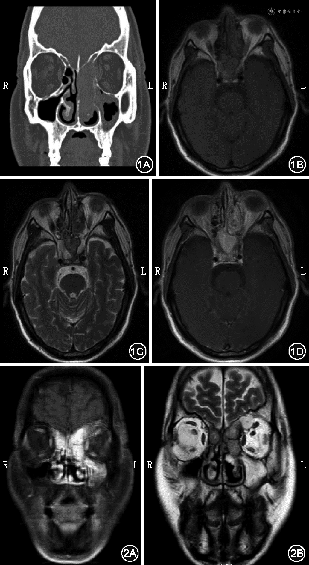 例1 患者男,61岁,因左侧持续性鼻塞伴淡黄色分泌物1月余来我院就诊。专科体格检查:外鼻无畸形,左侧鼻腔见新生物堵塞,各鼻窦区无压痛。鼻窦CT示左侧鼻腔内团块状软组织密度影,边界不清,周围骨质吸收破坏(图1A)。MRI提示左侧上颌窦、双侧筛窦、双侧额窦及蝶窦内斑片状长T1长T2信号(图1B、C),弥散加权成像(DWI)呈不均匀高信号,增强扫描呈明显不均匀强化(图1D)。入院后诊断为鼻腔肿物,取新生物病理回报其形态符合息肉。详细询问患者病史,患者于2005年因左肾透明细胞癌行左肾切除手术,考虑局部病理结果可能与实际病变存在差异,遂于全身麻醉下行手术探查。0°鼻内镜下见左侧鼻腔新生物,切除左侧钩突,开放上颌窦,低温等离子刀辅助下切除肿物,开放筛窦,见眶内壁骨质受损,低温等离子刀切除左侧眶内壁及部分脂肪组织。开放蝶窦,见蝶鞍及视神经管骨质破坏,电钻磨除部分骨质。开放额窦,见窦内充满新生物,切除肿物后,见左侧额窦后壁骨质破坏,部分硬脑膜裸露,取鼻中隔黏膜瓣修复。术后病理回报符合透明细胞性肾细胞癌转移,免疫组织化学(免疫组化)染色结果:CK(AE1/AE3)(+)、CAIX(+)、CD10(+)、CK7(-)、P504s(+)、TFE3(-)、PAX-8(+)、Vimentin(+)、Ki67(阳性率20%)。术后随访至半年时,患者出现左眼肿胀、视物模糊,复查MRI示双侧前组筛窦、双侧额窦、左侧上颌窦、双侧蝶窦内稍短T1长T2信号影,增强扫描可见强化,考虑为肿瘤复发(图2)。