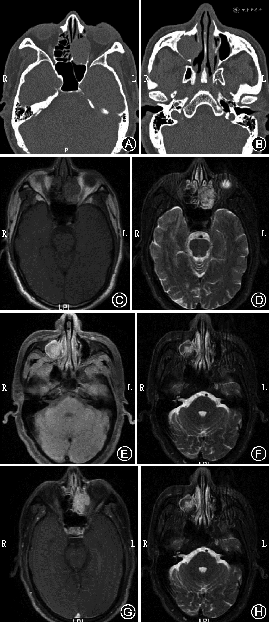 例2 患者男,63岁,因头痛1个月、体检发现“鼻窦肿物”4 d就诊于我院,病程中患者有双侧交替性鼻塞,伴脓涕。患者3年前行左肾摘除术,术后病理回报为玻璃体细胞癌。专科体格检查:鼻内镜下鼻腔内未见明显新生物。鼻窦CT提示左侧筛窦、右侧上颌窦内团块状软组织密度影,边界欠清,密度不均匀,部分突入左侧眼眶内,右侧筛窦、左侧蝶窦及邻近左侧眶内壁、筛骨、蝶窦上壁骨质破坏,右侧上颌窦病灶部分突入右侧筛窦,邻近骨质受压变薄(图3A、B)。MRI示左侧筛窦及右侧上颌窦内不规则等T1稍长T2信号(图3C~F),DWI未见明显高信号,增强扫描不均匀中度强化(图3G、H)。全身麻醉下行手术探查,0°鼻内镜下见左侧中鼻道膨隆,切除钩突,开放上颌窦,切除筛泡基板,开放筛窦,见有暗红色新生物占位,触之易出血,完全切除肿物,颅底骨质完整,左侧眶纸板部分缺如,去除左侧眶纸板见眶内筋膜完整。于右侧下鼻甲前端行泪前隐窝入路,见上颌窦内充满肿物,呈膨胀性生长,界限尚清。切除右侧钩突,开放上颌窦口,完整切除窦内肿物。术后病理回报符合肾透明细胞癌转移。免疫组化染色结果:CK(AE1/AE3)部分弱(+)、CK7(-)、Vimentin(+)、CD10(+)、CAIX(+)、PAX-8(+)、Ki67(阳性率10%)、P504s部分(+)、TFE3(-)。术后随访9个月无复发。