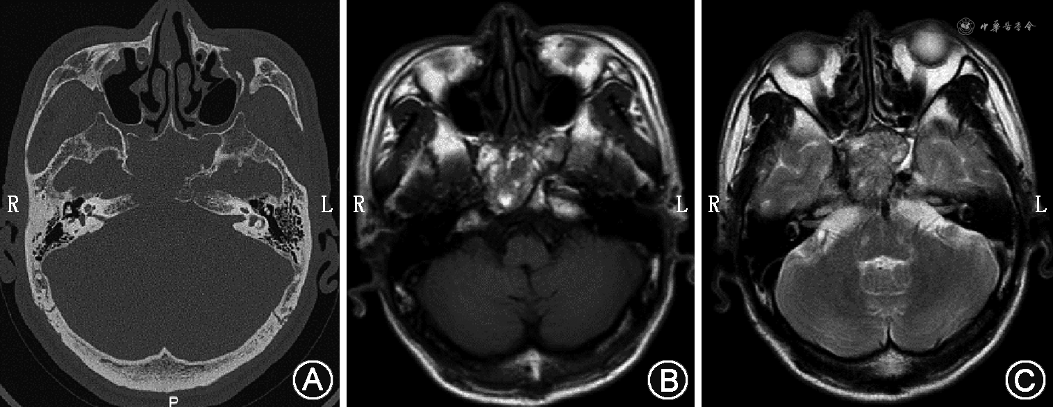 例3 患者男,50岁,因右眼复视2个月、加重3 d就诊。患者曾于4年前因肾癌行左肾摘除术。专科体格检查:右眼复视,粗测无明显视力下降,眼球外展障碍,眼睑略下垂,鼻中隔前份明显右偏,右侧蝶筛隐窝处略膨隆。颅底CT示蝶窦区团块状软组织影,大小约38 mm×37 mm×26 mm,蝶窦、蝶骨、蝶鞍、枕骨部分骨质破坏(图4A)。MRI示蝶窦区团块状稍长T1等T2信号影,内见斑片状短T1信号,大小约44 mm×32 mm×26 mm(图4B、C)。全身麻醉下行手术探查,见肿瘤占据蝶窦,且向下沿斜坡前方突至枕骨大孔,切除斜坡前方肿物,见斜坡旁颈内动脉段骨质部分缺损,斜坡偏右侧近海绵窦下方部分骨质破坏,肿物压迫右侧外展神经,并侵及左侧海绵窦下方斜坡旁骨质。完全切除肿物,电钻磨除受侵骨质后,见部分硬脑膜暴露,取左侧鼻中隔游离黏膜瓣修补。术后病理回报支持肾透明细胞癌转移。免疫组化染色结果:CK(AE1/AE3)少量(+)、Vimentin(+)、CD10(+)、PAX-8(+)、CAIX少量细胞膜(+)、p63(-)、S-100(-)、CgA(-)、Syn(-)、CK7(-)、HMB45(-)、Ki67(阳性率10%)、P504s(+)、TFE3(+)、EMA(-)、CD117(-)、MelanA(-)。