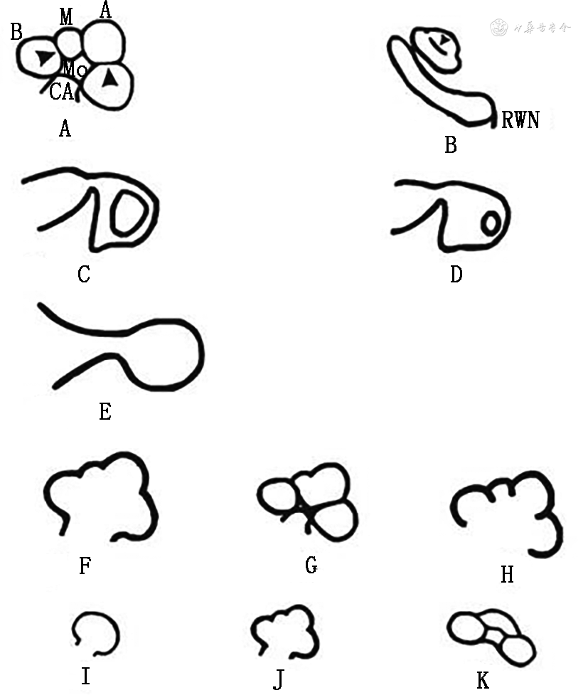 1.Sennaroglu 2002年内耳畸形分类:在Jackler内耳畸形分类的基础上,Sennaroglu和Saatci[5]于2002年分析23例患者的颞骨CT影像,提出新的内耳畸形分类。主要改变有2点:将不完全分隔分为不完全分隔Ⅰ型(IP-Ⅰ)和不完全分隔Ⅱ型(IP-Ⅱ);调整了CC与CA的胚胎发展顺序(图2)。