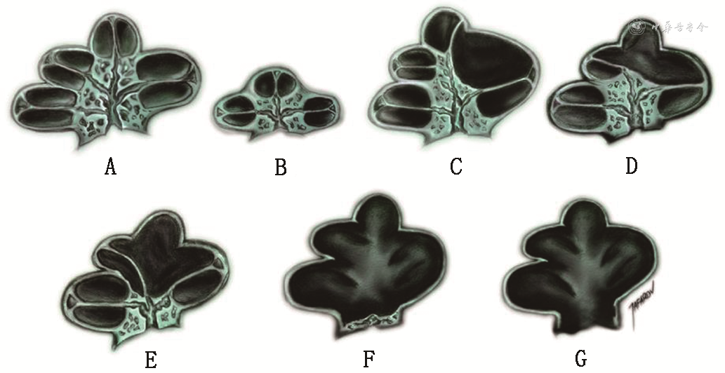 3. Sennaroglu 2016内耳畸形分类:之前的IEM分类是基于对CT表现的观察并且结合以前对内耳胚胎发育的认知加以分类和总结,2016年,Sennaroglu[7]通过光镜下观察内耳切片,提出了基于病理组织学的IEM分类,主要关注耳蜗的病理分型。在对IP和CH的病理组织学研究中,Sennaroglu等将蜗轴发育程度分为以下7级。① 正常蜗轴;② 短蜗轴;③ 前庭阶扩大:导致阶间隔膜上移,常见于IP-Ⅱ;④ 上部蜗轴缺失:上1/4蜗轴缺失;⑤ 部分蜗轴缺失:上1/2蜗轴缺失;⑥ 不完全蜗轴缺失:上3/4蜗轴缺失;⑦ 完全蜗轴缺失:耳蜗与IAC完全连通(图4)。