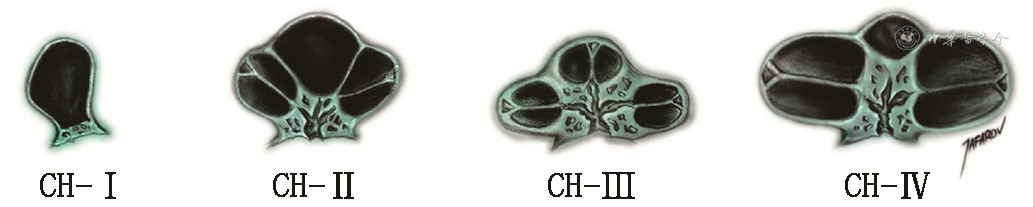 与IP-Ⅱ区别,Sennaroglu等强调了CH的具体定义为“耳蜗转数小于2圈”。CH被细化为以下3种类型。① CH-Ⅰ(芽状耳蜗):耳蜗形态为自IAC向外突出的听芽,没有蜗轴和阶间隔膜;② CH-Ⅱ囊性增生性耳蜗:耳蜗较小,没有蜗轴及阶间隔膜,但外部形态正常,由于耳蜗与IAC连接较多,电极易脱落进入IAC;③ CH-Ⅲ:耳蜗转数小于2圈,蜗轴与阶间隔膜较短,形态与正常耳蜗相似但较小。
