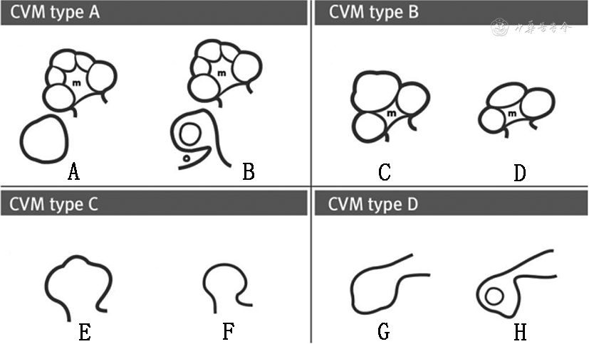 Jeong等根据CT上耳蜗和蜗轴的形态将内耳进行分为4类(图6),具体如下。① A型:有正常耳蜗及蜗轴;② B型:耳蜗畸形且蜗轴部分缺失;③ C型:耳蜗畸形且蜗轴缺失;④ D型:耳蜗与蜗轴缺失。与Sennaroglu 2010分类标准对比,A型包括前庭导水管扩大及半规管或迷路发育不良,B型包括IP-Ⅱ及CH-Ⅲ,C型包括IP-Ⅰ、CH-Ⅰ及CH-Ⅱ,D型包括CC及CA。