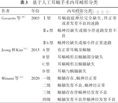内耳畸形分类对人工耳蜗术前指导及术后效果预测有重要的临床意义。基于胚胎学和影像学的分类方法将内耳畸形进行形态上的区分。Jackler与Sennaroglu等根据胚胎发育顺序对内耳畸形定义,Adibelli等基于影像学对内耳各解剖亚组进行标准化描述。然而,尽管分类更加细化,但临床上影像学分辨能力有限,且部分内耳畸形间的听力学差异并不明显。因此为了指导CI手术,产生了更强调临床实用性的基于人工耳蜗手术的内耳畸形分类。Govaerts内耳畸形分类帮助预测CND患者的CI术后效果。Jeong和Minami内耳畸形分类简单,可指导选择电极和术式,同时预测术后效果,对CI手术具有更强的指导意义。