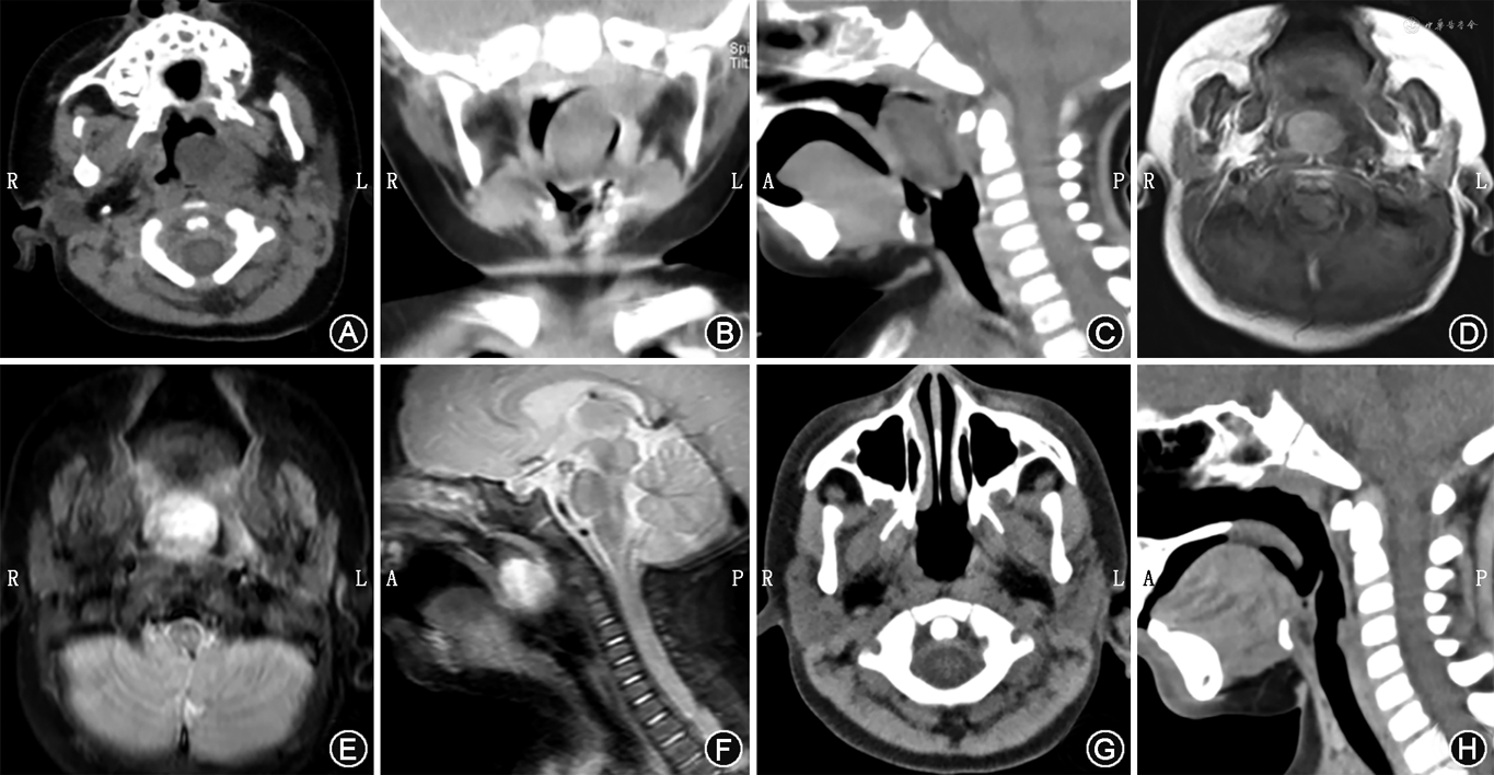患儿,男,6个月,因“呼吸困难2个月,加重2 d”于2019年4月7日入院。2个月前患儿无明显诱因出现呼吸困难,喝奶时常需换气,无咳嗽、发热,无意识障碍,就诊于当地社区医院建议观察随诊;2 d前患儿呼吸困难加重,活动时更明显,遂就诊于当地妇幼保健院,胸部X线片提示支气管肺炎,建议就诊上级医院,遂至我院就诊。患儿既往体健,否认“支气管哮喘”等系统疾病史。查体:神志清醒,精神状态尚可,发育正常,营养良好,急性面容,呼吸困难。专科查体:口咽部见一光滑灰白色新生物,咽腔狭窄;哭闹时吸气相见锁骨上窝、胸骨上窝明显内陷。外院血液检查提示:白细胞11.78×109/L;入院后血常规提示:白细胞22.77×109/L。影像学检查(CT和MRI)提示左侧鼻咽部肿物(图1)。