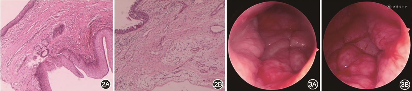 入院后经检查初步诊断为:(1)鼻咽部囊肿?;(2)左中耳乳突炎;(3)肺部感染。为进一步治疗及明确诊断,2019年4月11日于全身麻醉下经鼻内镜行鼻咽部新生物切除术。开口器暴露口咽部,导尿管经鼻腔拉起软腭,70°鼻内镜下见左侧咽鼓管咽口及鼻咽部灰白色、灰褐色光滑息肉样实性组织,质地中等,根蒂位于左侧咽鼓管内;完整剥离肿物后探查左侧、右侧咽鼓管,见左侧咽鼓管咽口较右侧扩大,未见新生物残留,标本送病理。术后给予抗感染治疗,患儿呼吸通畅,5 d后出院。病理回报:左侧咽鼓管新生物表面衬覆假复层纤毛柱状上皮,黏膜下层为疏松结缔组织,散在淋巴细胞浸润,其内见成熟脂肪组织,病理诊断为复合性迷离瘤;鼻咽部新生物表面衬覆未角化成熟鳞状上皮,黏膜下层见皮脂腺及增生并玻璃样变性的纤维结缔组织,病理诊断为单纯性迷离瘤(图2)。术后1个月、6个月、1年、2年间断随访,患儿无呼吸困难及吞咽困难。术后2年随诊,耳内镜下见双耳鼓膜完整、标志清;声导抗检查左耳鼓室图A型曲线,右耳As型曲线;鼻内镜下见左右鼻咽部对称,左侧咽鼓管咽口光滑,未见新生物(图3);复查鼻咽部CT,未见复发迹象。
