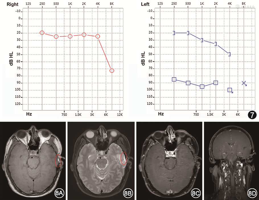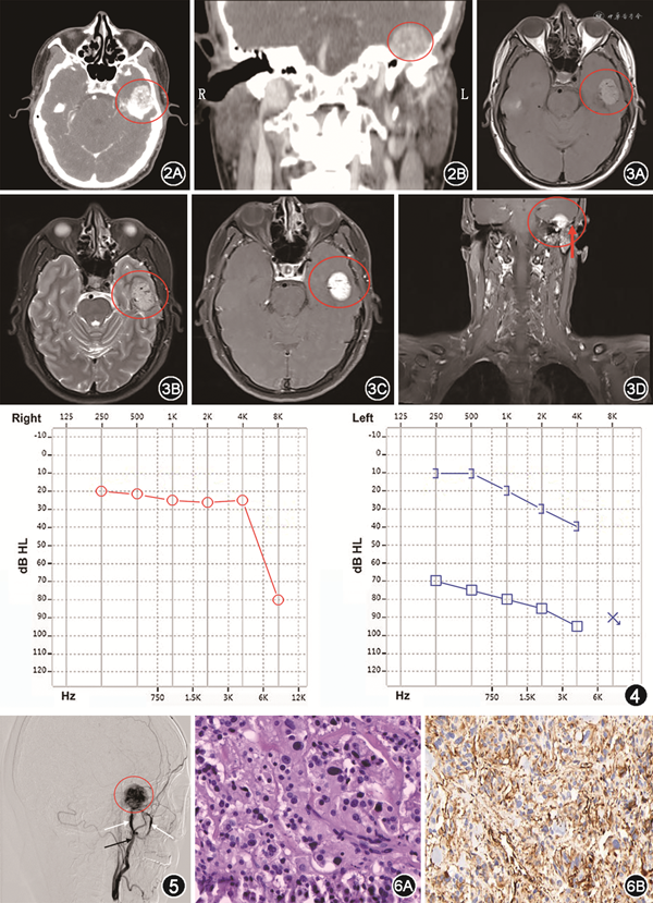 患者男,48岁,因“左侧嘴角歪斜半个月”于2017年9月11日就诊于青岛大学附属烟台毓璜顶医院耳鼻咽喉头颈外科。患者半个月前无明显原因出现左侧嘴角歪斜,进食及饮水时可从左侧嘴角漏出,鼓腮左侧漏气,门诊以“左侧周围性面神经麻痹原因待查”收入院。既往有左耳渐进性听力下降、搏动性耳鸣4年,无高血压病史,家族中无相似病史。入院查体:左侧面部痛温觉、触觉略差,左侧额纹消失、鼻唇沟变浅,用力眼睑闭合不全。按照House-Brackmann面神经功能分级为Ⅲ~Ⅳ级,耳内镜(图1)见左侧鼓膜松弛部及紧张部前方鼓膜膨出,血管扩张,鼓膜可见搏动,透过鼓膜可见鼓室内有红色新生物。颞骨增强CT(图2)见左侧颞骨占位侵犯中耳,耳蜗骨壁可疑受累,左侧鼓室天盖破坏并颅中窝受侵犯。颞骨增强MRI(图3)示左侧颞骨颅内见类圆形稍短TI稍短T2异常信号肿块,大小2.4 cm×2.7 cm×3.0 cm,其内信号不均,可见多发血管流空信号,T1WI增强可见肿块明显强化,侵犯硬脑膜。纯音测听(图4)示左侧气导听阈80 dB,骨导听阈20 dB,气骨差60 dB,呈传导性聋。初步诊断:颞骨肿瘤累及颅中窝(左);周围性面瘫 Ⅲ-Ⅳ级(左)。术前行数字减影血管造影(DSA)检查,显示肿物血供丰富,由左侧颈外动脉的颌内动脉、咽升动脉及其他侧支循环血管供血(图5)。术前完善相关检查后,行左侧颈外动脉结扎,采用左侧乳突颅中窝联合入路,切断并封闭外耳道,磨除乳突及外耳道后壁,乙状窦轮廓化,见肿瘤充满鼓室并向上侵入颅中窝,向上切除颞骨鳞部骨板,暴露硬脑膜,见肿瘤突破硬脑膜,术中冰冻病理示良性肿瘤,初步考虑副神经节瘤。“L”形切开硬脑膜,将硬脑膜瓣翻向前方,暴露大脑颞叶,见肿瘤与脑组织有粘连,用脑压板向上牵拉大脑颞叶,发现肿瘤易与大脑颞叶分离,用脑棉逐渐将肿瘤与脑组织分离,双极电凝分块将突入颅内的肿瘤切除,并分离肿瘤与鼓室各壁的粘连,见肿瘤与鼓室内壁及鼓岬粘连较紧,听小骨已破坏消失,电凝分块切除肿瘤,鼓室内壁骨质未见受累,肿瘤沿咽鼓管方向向前侵犯,完整切除肿瘤后,骨性咽鼓管口用肌肉填塞封闭。见肿瘤侵及面神经水平段及垂直段上部,将肿瘤与面神经分离,并保留面神经完整性,双击电凝妥善止血,肿瘤完整切除,缝合脑膜,术腔用腹部脂肪填塞,逐层缝合耳后切口。术后常规病理示副神经节瘤,免疫组化示CgA(+),Syn(+)、S-100(部分+)、Vim(+)、CK(-)、EMA(-)、PR(-)、CR(-)、Ki67阳性率约5%(图6)。最终诊断:鼓室球体瘤(左),Fisch分级为D级。术后左侧面瘫略有加重,House-Brackman面神经功能分级为Ⅳ级。术后轻度眩晕,两天后眩晕消失,术后无复视、呛咳、声音嘶哑、无脑脊液漏、无颅内血肿、无脂肪液化,术后听力较术前略有下降(图7)。随访3年,面瘫恢复到术前水平,复查颞骨增强MRI(图8)肿瘤无复发。