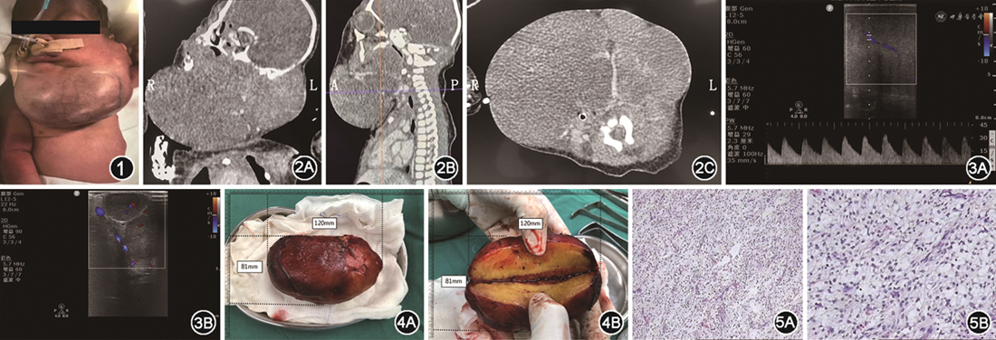 患儿男,第1胎,第1产,胎龄36+4周,单胎。因“出生后发现颈部巨大包块,气管插管辅助呼吸7 h”于2021年3月14日120急诊转入成都市妇女儿童中心医院。患儿因胎膜早破10 h,外院超声检查发现胎儿颈部9.9 cm×6.5 cm×8.8 cm的无回声区,剖宫产娩出。出生后发现颈部巨大包块(图1),Apgar评分1 min为5分,5 min为8分,10 min为8分(肌张力、喉反射各扣1分)。出生后立即给予气管插管呼吸机辅助呼吸7 h,气管插管球囊给氧状转入我院。入院查体颈部巨大包块,气管插管球囊给氧。入院诊断:颈部巨大包块性质待查,气道狭窄,早产,新生儿轻度窒息。入院后颈部增强CT加三维重建检查示:颈部正中巨大不规则低密度灶包块,大小12.0 cm×8.1 cm×7.1 cm,口咽气道明显受压闭塞,考虑脉管畸形、淋巴管畸形可能性大。咽部明显受压向右移、变窄。先天性心脏病、房间隔缺损、动脉导管未闭,与肺动脉连接处狭窄近闭锁(图2A~C)。超声检查提示:颈部实性占位,巨大实性占位范围于右侧边界至耳根部,左侧边界至耳后,上至颏下,下界无法探及,其内可见动静脉血流。心脏彩色超声提示:房间隔小缺损,房水平左向右分流,左心室收缩功能测值正常范围内(图3A、B)。鉴于该新生儿疾病罕见,颈部巨大包块、已压迫口咽气道,气管插管呼吸机辅助不能拔管,新生儿科邀求医院多学科(耳鼻咽喉头颈头颈外科、小儿外科、小儿血管瘤外科、放射影像科、超声室、口腔科、麻醉科、手术室、介入科等)进行疑难病的诊断与治疗方案的讨论,讨论最终意见:建议尽快行颈部包块切除,解除口咽气道压迫(如包块不能分离,解除口咽气道压迫,必要时需要行气管切开),术后将所切除的包块病变组织送病理检查明确性质后再后续治疗。将讨论意见与患儿家长沟通后,家长接受该治疗方案。