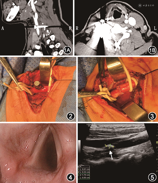 本例患者在我科与血管外科、脊柱外科、麻醉科、手术室等多学科联合协作治疗下成功转危为安,主要得益于以下几方面:一是术前在多学科综合治疗协作组(MDT)模式下进行详细的讨论,充分评估手术风险,制订了详细的治疗方案,并与患者家属取得了充分的沟通;二是术中多学科的得力合作,各科室之间及时沟通,密切配合;三是术后护理团队能力较强、经验丰富。在面对这种凶险情况下,单靠耳鼻喉科独立治疗是很难完成的,因此我科积极探索以MDT模式进行危急重症疾病的救治具有重要意义,对临床颈部开放性损伤的诊疗提供一定的参考。