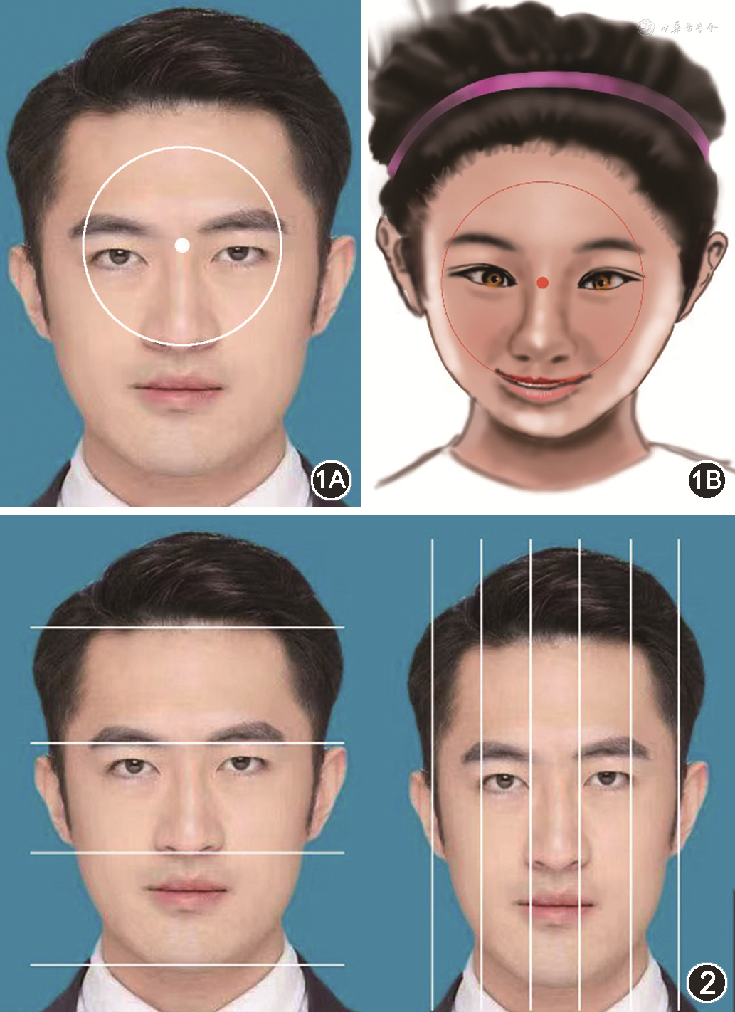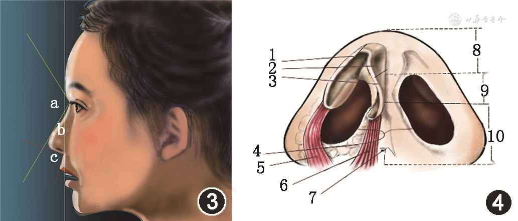 鼻部自身及鼻与面部各解剖单位有比例相关性。若以鼻根点为中心、鼻根点与外眦的距离为半径画圆,在成人,此圆弧经过鼻翼和鼻小柱基底;在儿童,此圆弧经过口角(图1)。按照我国经典的面部“横三”“竖五”分割法,将人脸的长度分为三等分,宽度分为五等分。长度三等分点即从额部发际中点至下颌颏缘中点连线上的眉间中点和鼻小柱底部。宽度五等分也叫五眼法,即在眼部水平线上、左右耳孔之间的距离,正好等于5个眼睛的宽度(图2)。鼻长约占面长的1/3,鼻宽约占面宽的1/5,都居于中份。鼻尖的高度为鼻长的1/3。鼻梁的起点(鼻根点),白种人在两眉连线中点,东方人在两眉连线和内眦连线之间的中点。外鼻的宽度为两鼻翼外侧缘的距离。东方人的鼻背男性近乎挺直,女性略带弧度,以鼻尖微微上翘为美。鼻小柱与上唇人中构成的夹角为鼻唇角,一般90°为理想角度。前额至切牙的垂直线与鼻根点至鼻尖的斜线的夹角为鼻面角,东方人约25°~30°,理想角度为30°~33°,白种人约30°~40°。鼻背与额部的角度为鼻额角,白种人为120°,东方人大于120°(图3)。鼻锥底为等腰三角形,鼻小柱分小叶部、中央部和基底部(图4)。鼻孔为长轴向内上方的卵圆形。理想鼻的正面观和侧面观皆呈黄金三角形,鼻与面部结构比例协调[1, 2, 3]。