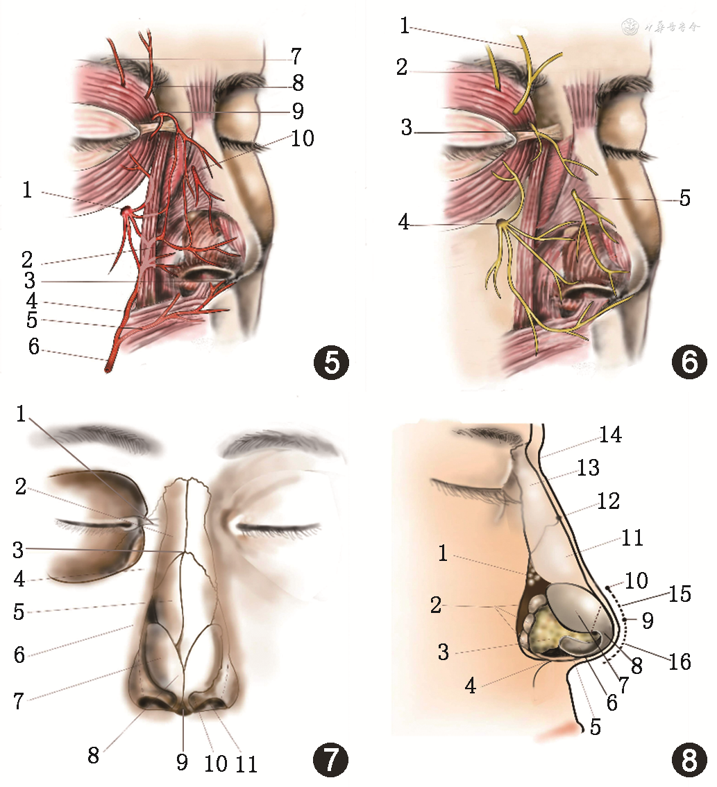 2. 鼻的血管、神经:大多数鼻部血管、神经在鼻部SMAS中或在其表层。外鼻的动脉来源于颈外动脉和颈内动脉。双侧颈外动脉的面动脉支和眶下支、颈内动脉的眼动脉分支-筛前动脉分别供应该侧外鼻(图5)。鼻背的血供来源于眼动脉的鼻背动脉和筛前动脉鼻外支。前者在内眦韧带上方从眼轮匝肌穿出,向下分出3~4支主干分别供应鼻背和鼻侧,并和来源于上颌动脉的眶下支、来源于面动脉的侧鼻动脉形成网络连接,供应鼻侧和鼻尖。筛前动脉鼻外支从鼻骨和隔背软骨背侧面之间以及附着其上的鼻横肌穿出,向下供应鼻背和鼻尖。据观察,鼻尖部血供因人而异,有单侧侧鼻动脉(2/20)、双侧侧鼻动脉(8/20)、单侧鼻背动脉(4/20)、双侧鼻背动脉(1/20)、单侧侧鼻动脉和鼻背动脉(5/20)几种供血情况[6]。外鼻特别是鼻尖部的血供受阻会导致鼻尖皮肤坏死,整形手术中要特别注意。据笔者经验,只要紧贴软骨膜,沿着隔背软骨背侧面正中向鼻骨分离,遇到鼻骨后紧贴骨面分离暴露鼻骨,然后紧贴鼻骨下缘锐性分离鼻骨与隔背软骨,一般不会损伤上述血管[9]。面动脉分出角动脉和上唇动脉,角动脉在分出侧鼻动脉之前分出2~3小支供应鼻翼外侧。上唇动脉向鼻基底和鼻小柱分出终末支滋养血管。