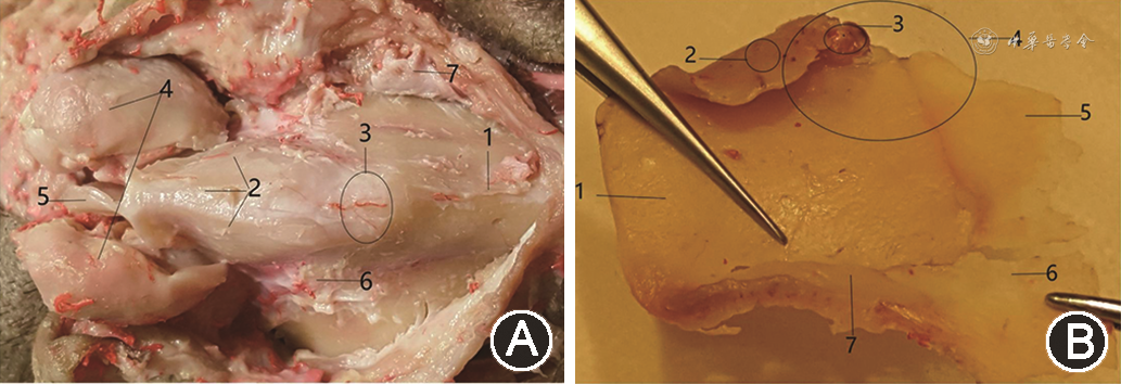 软骨性鼻锥由隔背软骨和双侧大翼软骨(greater alar cartilages,GACs)通过纤维结缔组织、韧带和小籽骨连接形成[16](图7、8)。