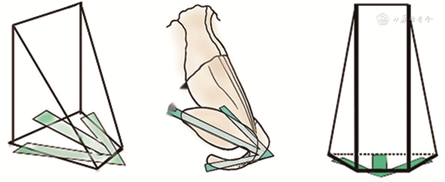 “三脚架鼻尖支撑理论”认为[26],双侧GACs外侧脚和内侧脚构成三脚架,将鼻尖支撑固定于面部。整形医生可以根据这个支架形态判断畸形所在,并通过调整支架的长度和位置而改变鼻尖形状。笔者在大量临床实践中发现,QC尾侧端是三脚架的核心支柱(图10),双侧GACs内侧脚需固定于QC尾侧端才稳定。在GACs不变的情况下,当QC尾侧端向一侧鼻腔脱位,或者高度宽度减小、支撑力降低时,鼻尖会发生变形;反之,矫正QC尾侧端会使鼻尖变得对称、直挺[17,27]。蕴藏在鼻尖部软骨中的弹性力量和附着其上的肌肉作用,以及鼻面部骨对于这种弹性力量的平衡,也是保证鼻尖形态和鼻阀功能的重要因素[28, 29]。