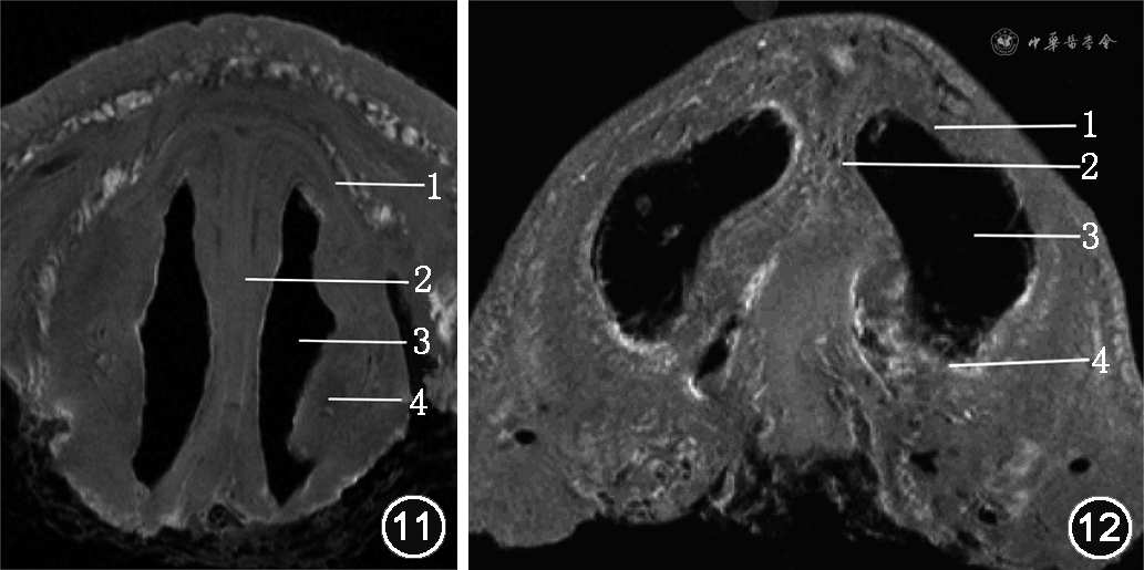 1. 隔背软骨:隔背软骨由ULCs和鼻中隔软骨即方形软骨(quadrangular cartilage,QC)构成,又称ULCs-QC复合体。ULCs和QC在胚胎上同源[11],ULCs-QC在解剖中是一个结构单位。在功能性鼻整形手术中,隔背软骨应尽可能被完整保留[14, 15,17, 18]。与鼻锥底平行的切面显示,鼻中隔自前下至后上呈I、T和Y形[19]。大多数情况下,ULCs与QC之间自前下(尾侧端)至后上(接近鼻骨)形成由锐角变为近似直角的弧形。对于鼻梁扁平的个体,其前下和后上都是近似直角的弧形。白种人ULCs与QC之间的相应角度为15°~80°[6]。