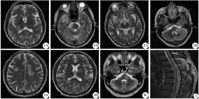 1A:右侧侧脑室后脚长T2异常信号,1B:右侧颞叶、右侧脑干长T2异常信号;2A:右侧丘脑、颞叶长T2异常信号,2B:左侧延髓、小脑长T2异常信号;3A:双侧大脑半球长T2异常信号,3B:右侧侧脑室后脚、左侧基底节区长T2异常信号,3C:脑干及左侧桥臂片状长T2异常信号,边缘不清