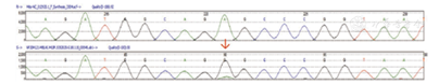 上图为参考序列;下图为患者基因测序序列;箭头所示为MT-TLI基因A3243G位点发生突变