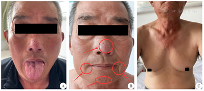 患者 男性,68岁,因间断四肢无力、构音不清、咀嚼无力5年,再发加重2个月,于2021年6月入河北以岭医院重症肌无力科。患者于2016年3月无明显诱因出现双眼睑下垂,症状呈波动性,晨轻暮重,劳累后加重,休息后减轻;8月患者劳累后出现双眼睑下垂加重,同时伴有咀嚼无力、饮水呛咳、构音不清、气短、四肢无力等症状,就诊于当地市医院,行新斯的明试验阳性,诊断"MG";2020年12月曾入我院,给予胆碱酯酶抑制剂、激素治疗10 d,症状好转出院。出院3个月后停服激素,以每日60 mg溴吡斯的明维持,5年来饮食吞咽正常,言语清晰,四肢有力,无胸闷气短等症状。患者2021年4月劳累后出现鼓腮无力,说话不清,咀嚼、吞咽困难,四肢无力,于6月再次就诊于我院。患者已婚,50岁左右性功能丧失,育1子1女,均体健,否认家族成员中有类似症状。既往乳腺增生10余年。体格检查:意识清楚,言语不清,定向力、记忆力、计算力正常;闭目不紧,埋睫征不全,眼裂等大,上眼睑未见下垂,双侧瞳孔正大等圆,对光反射灵敏,眼球活动灵活,无复视;鼓腮漏气,双侧咬肌无力,咽反射消失,伸舌居中,舌肌萎缩,中央有纵行沟槽(图1A),口周肌肉萎缩(图1B),并可见细小肌束震颤。双侧乳房发育(图1C)。双手震颤,四肢近端肌肉轻度萎缩并可见粗大震颤,前臂肌群及胸肌可见细小束颤。颈部肌力4级,双上肢肩肘腕指肌力为4-4-4-4级,髋膝踝趾肌力为3-4-4-4级,四肢肌张力降低。肱二、三头肌腱反射减弱,跟、膝腱反射消失,霍氏征(-),巴氏征(-),腹壁反射消失,深浅感觉未见异常,肌疲劳试验阳性。MG定量评分(QMGS)为15分,MG绝对评分(ARS-MG)为28分,MG日常生活评分(MG-ADL)为12分,美国重症肌无力基金会(MGFA)分型标准为ⅣB型。