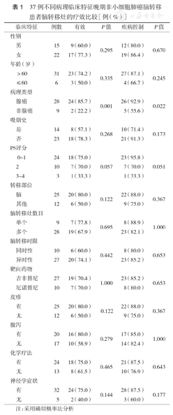 37例不同病理临床特征晚期非小细胞肺癌脑转移患者脑转移灶的疗效比较[例(%)]