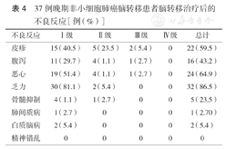 肺癌脑转移患者治疗后皮疹Ⅰ、Ⅱ、Ⅲ、Ⅳ级发生率分别为40.5 %、23.5 %、5.4 %、0;Ⅰ、Ⅱ、Ⅲ、Ⅳ级腹泻发生率分别为29.7 %、1.08 %、2.70 %、0;Ⅰ、Ⅱ、Ⅲ、Ⅳ级恶心发生率分别为51.4 %、1.08%、2.70%、0。Ⅰ、Ⅱ、Ⅲ、Ⅳ级骨髓抑制发生率分别为1.08 %、2.70 %、0、0。肺间质病及白质脑病发生率较低,均只有Ⅰ级,分别为2.7 %、5.4 %。本组患者治疗后未发生精神错乱(表4)。