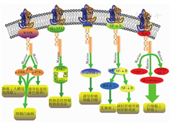 MAPK是广泛存在于哺乳动物细胞内的一类丝氨酸/苏氨酸蛋白激酶。最近对MAPK信号通路的研究取得很大进展。MAPK家族分4个成员:(1)细胞外信号调节激酶[MAPK/细胞外调节蛋白激酶(ERK)];(2)另类端激酶(c-JunN),又称应激激活的蛋白激酶系统;(3)p38 MAPK;(4)ERK5/BMK1 (BMK1)。其中ERK也被称为丝裂原激活的MAPK信号通路,而后3条为应激激活的通路。已有相关研究证实[5],MAPK信号转导通路可被一系列的细胞外信号或刺激物所激活,激活后的MAPK信号通路将细胞外信号转导至细胞及其核内,通过磷酸化核转录因子、细胞骨架蛋白及酶类等引起细胞生物学反应(如细胞增殖、分化、转化及凋亡等),并与炎症、肿瘤等多种疾病的发生密切相关。不同的MAPK信号通路,可由不同的刺激因素激活,形成不同的转导通路,通过其相互调控而介导不同的细胞生物学反应[6]。
