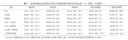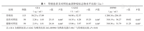 采用电化学发光法及酶联免疫吸附法检测113例胃癌患者、50例胃良性病变患者及50名健康体检者血清CEA、CA242、HSP60水平。
