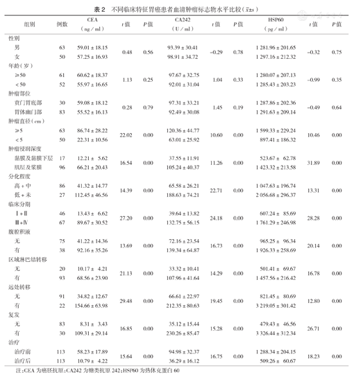 | 胃癌组 | 113 | 58.23±17.89 | 94.98±32.37 | 1 288.34±204.15 | ||||||