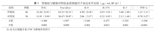 IL-7是由骨髓基质细胞产生的糖蛋白,是IL-2家族的重要成员之一,具有与IL-2相似的生物学活性。最初发现IL-7是B前体细胞生长因子,之后的研究表明IL-7也是一种T细胞生长因子,在T细胞发育和维持稳定方面发挥重要作用,并可增加细胞毒性T细胞及T杀伤细胞的数量,诱导促炎因子及增加单核细胞和T细胞的抗肿瘤活性[16]。研究表明IL-7基因整合至肿瘤细胞后,肿瘤细胞免疫原性增强,其机制可能与肿瘤细胞表面主要组织相容性复合体(MHC)抗原、细胞间黏附分子(ICAM)以及肿瘤相关蛋白等表达增强有关;IL-7基因修饰瘤苗能诱导机体的抗肿瘤细胞免疫,并使瘤细胞成瘤性下降,具有与IL-2一样的抗肿瘤作用。本研究结果中胃癌患者血清中IL-7表达水平较健康对照组升高,提示其在抗胃肿瘤方面发挥作用。