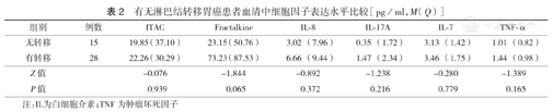 有淋巴结转移胃癌患者血清中各细胞因子表达水平均高于无淋巴结转移者,但差异均无统计学意义(均P>0.05)(表2)。