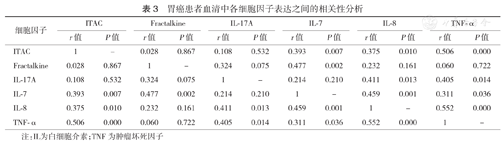 ITAC、Fractalkine、IL-8、IL-17A、IL-7、TNF-α的高表达可能与胃癌的发生、发展有关。血清中高水平IL-8可能是预后不良的指标。各细胞因子之间的相互作用、相互影响与肿瘤的发生有着一定的关系。