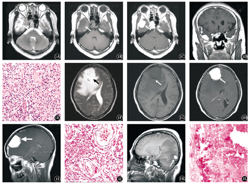 1A~1E:例1,男性,44岁,晕倒后双上肢抽搐,口吐白沫,右侧颞部血管瘤型脑膜瘤;1A:MRI示横轴面T2WI示肿瘤呈类圆形无分叶(箭头所指),实性成分呈稍高信号,边界清晰,水肿较轻;1B:MRI示横轴位T1WI示肿瘤呈均匀等信号(箭头所指);1C:MRI示横轴面T1WI增强示肿瘤明显均匀强化(箭头所指);1D:冠状面T1WI增强示肿瘤以宽基底与大脑镰相连,可见脑膜尾征(箭头所指);1E:肿瘤细胞形态学检查示大量增生的血管,其间散在灶状合体细胞,胞质丰富,细胞界限不清,大小不等,核膜清楚,略呈空泡样;周围见薄层纤维组织 HE ×400;1F~1J:例2,女性,43岁,头痛、头晕、反应迟钝,右侧额部大脑镰旁血管瘤型脑膜瘤;1F:MRI示横轴面T2WI肿瘤呈浅分叶,边界清晰,水肿明显,邻近脑组织受压,呈稍高信号,后缘可见不规则更高信号(液化坏死)(箭头所指);1G:MRI示横轴面T1WI示肿瘤呈稍低信号,周围可见小圆形血管流空影(箭头所指);1H:MRI示横轴面T1WI增强示肿瘤明显强化,侧脑室明显受压(箭头所指);1I:MRI示矢状面T1WI增强示肿瘤强化欠均匀,内可见不规则低信号液化坏死区(粗箭头所指),与硬脑膜宽基底相连,可见脑膜尾征(细箭头所指);1J:肿瘤细胞形态学检查示丰富扩张的薄壁血管或血窦和分布其间的肿瘤细胞,肿瘤细胞胞质丰富,淡红染或透亮,细胞界限不清,大小不等,核膜清楚,细胞异型不明显,部分血管管壁增厚,玻璃样变,血管及血窦腔内可见大量红细胞 HE ×400;1K、1L:例3,女性,55岁,右侧头痛,右侧枕部血管瘤型脑膜瘤;1K:MRI示矢状面T1WI示肿瘤边界尚清,水肿明显,呈稍低信号,内可见斑状高信号(出血)(箭头所指);1L:细胞形态学检查示肿瘤组织由大小不等的血管构成,血管壁厚薄不均,血管间见漩涡状及合体状上皮样细胞 HE ×100