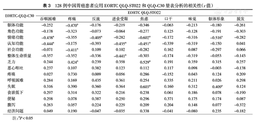 128例中国胃癌患者应用EORTC QLQ-ST022和QLQ-C30量表分析的相关性(r值)