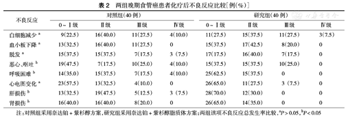 两组晚期食管癌患者化疗后不良反应比较[例(%)]