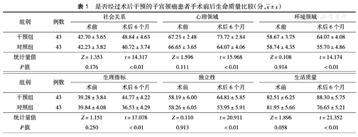 总之,子宫颈癌术后患者由于生理变化、心理压力等因素,导致生命质量下降,从心理、生理、家庭、社会等方面对患者进行术后干预,可以提高患者的生命质量。
