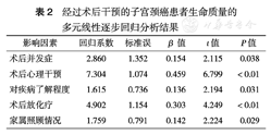 ±s)表示,如果符合正态分布且方差齐时,两组间比较采用t检验;如果不符合正态分布则用秩和检验。子宫颈癌患者生命质量影响因素分析采用多元逐步回归分析:以患者的生命质量评价量表总分为因变量,以文化程度、患者对疾病了解程度、术后放化疗、术后并发症、家属照顾情况、是否保留卵巢、术后心理干预为自变量,赋值后进行Logistic多元线性逐步回归分析,α入=0.05,α出=0.10。检验水准为α=0.05(双侧)。