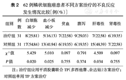 | 组别 | 例数 | 白细胞减少 | 血小板减少 | 贫血 | 腹泻 | 肝毒性 | 肾毒性 |