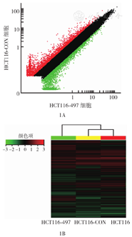 HCT116-497细胞为miR-497过表达细胞,HCT116-CON细胞为阴性对照细胞;1A:比较分析散点图,红色和绿色标记的数据点分别表示HCT116-497细胞与HCT116-CON细胞倍数变化(fold change)≥2.0和≤-2.0的基因,黑色标记表示倍数变化-1.9~1.9的基因,为表达基本无差异的基因;1B:聚类分析图,红色为表达上调,绿色为表达下调